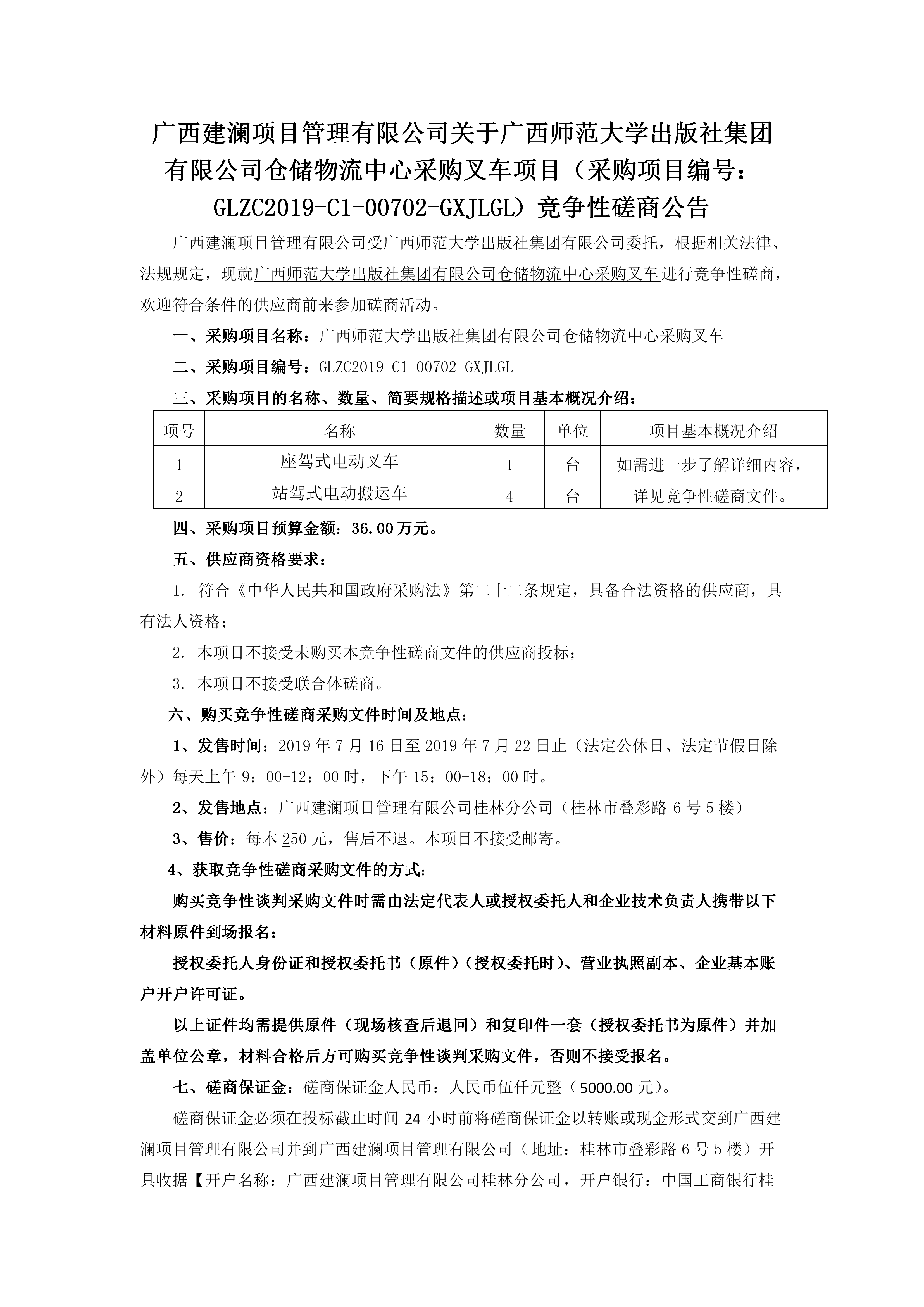 廣西建瀾項目管理有限公司關(guān)于廣西師范大學(xué)出版社集團有限公司倉儲物流中心采購叉車(chē)項目(采購項目編號:GLZC2019-C1-00702-GXJLGL)競爭性磋商公告